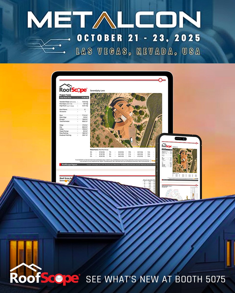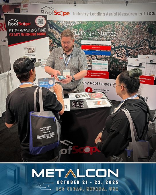 @MyScopeTech RoofScope is live at MetalCon! Ready to make roofing faster and more profitable? Get 99% accurate aerial measurements, property data & insights, SmartQuotes & POs in under 3 hours. Visit us at booth 5075! #MetalCon #RoofingTech #ConstructionTech